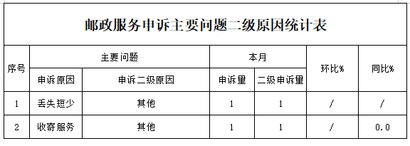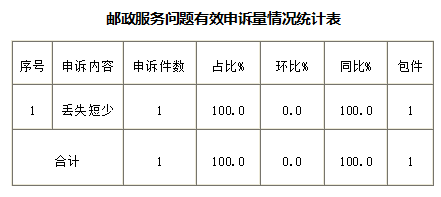 用户对邮政服务问题有效申诉1件,同比增长100%,申诉的主要问题丢失短少。