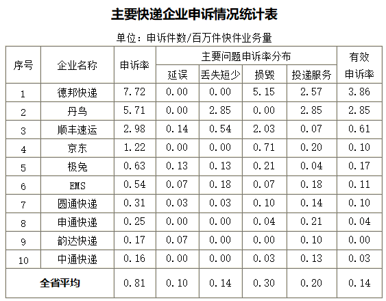 全省快递企业申诉率(百万件快件业务量)平均为0.81,有效申诉率平均为0.14。用户对快递企业申诉主要问题中,快件延误申诉率平均为0.1,快件丢失短少申诉率平均为0.14,快件损毁申诉率平均为0.3,快件投递服务申诉率平均为0.2,高于全省快递企业申诉率的有4家。