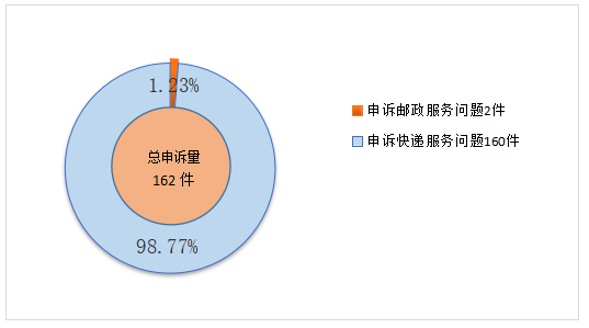 通过“12305”邮政业用户申诉电话和申诉网站共处理申诉162件,环比下降0.61%,同比下降31.93%。申诉中涉及邮政服务问题的2件,占总申诉量的1.23%,环比增长100%,同比下降81.82%;涉及快递服务问题的160件,占总申诉量的98.77%,环比下降1.23%,同比下降29.52%。