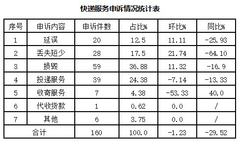 1.用户对快递服务问题申诉160件,环比下降1.23%,同比下降29.52%。