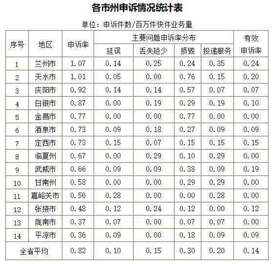 各市州申诉率(百万件快件业务量)平均为0.82,有效申诉率平均为0.14。各市州申诉主要问题中,快件延误申诉率平均为0.1,快件丢失短少申诉率平均为0.15,快件损毁申诉率平均为0.3,投递服务申诉率平均为0.2,高于全省平均申诉率的市州有4个。