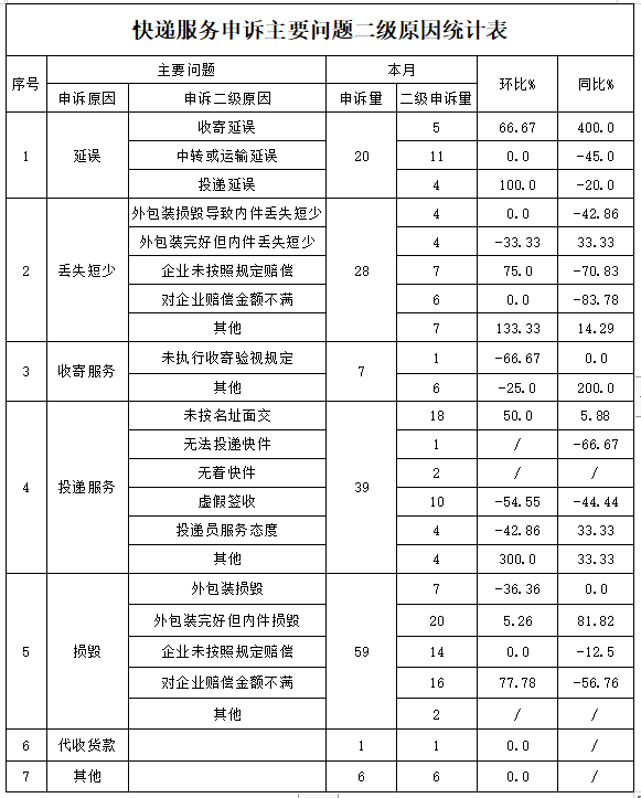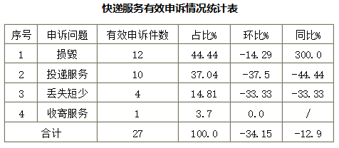 2.受理的申诉中有效申诉(确定企业责任的)为28件,环比下降33.33%,同比下降12.5%。其中,涉及邮政服务问题1件,涉及快递服务问题27件,环比下降34.15%,同比下降12.9%。