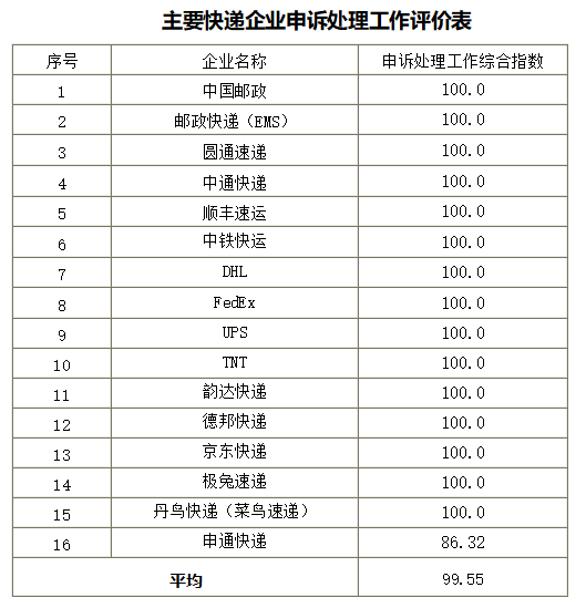 16家主要快递企业申诉处理工作综合指数平均为99.55,高于平均综合指数企业有15家。