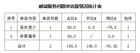 用户对邮政服务问题申诉2件,同比下降81.82%。