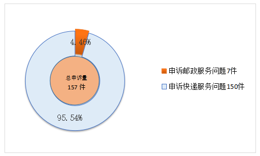 通过“12305”邮政业用户申诉电话和申诉网站共处理申诉157件,环比下降3.09%,同比下降44.52%。申诉中涉及邮政服务问题7件,占总申诉量的4.46%,环比增长250%,同比下降30%;涉及快递服务问题150件,占总申诉量的95.54%,环比下降6.25%,同比下降45.05%。