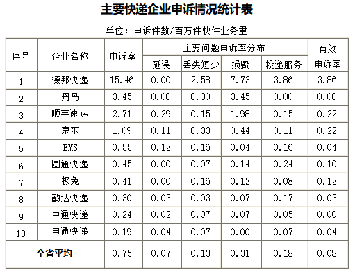 全省快递企业申诉率(百万件快件业务量)平均为0.75,有效申诉率平均为0.08。用户对快递企业申诉主要问题中,快件延误申诉率平均为0.07,快件丢失短少申诉率平均为0.13,快件损毁申诉率平均为0.31,快件投递服务申诉率平均为0.18,高于全省快递企业申诉率的有4家。