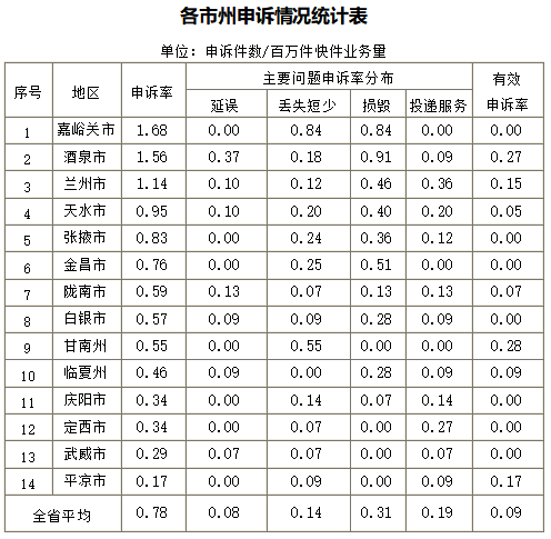 各市州申诉率(百万件快件业务量)平均为0.78,有效申诉率平均为0.09。各市州申诉主要问题中,快件延误申诉率平均为0.08,快件丢失短少申诉率平均为0.14,快件损毁申诉率平均为0.31,投递服务申诉率平均为0.19,高于全省平均申诉率的市州有5个。