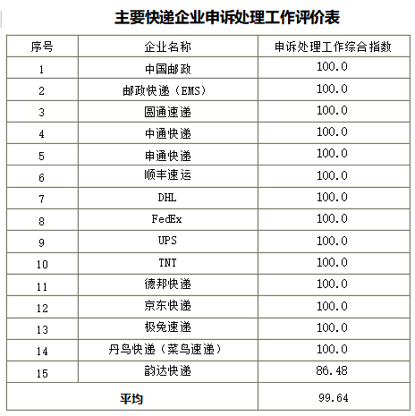 15家主要快递企业申诉处理工作综合指数平均为99.64,高于平均综合指数企业有4家。