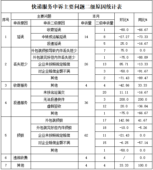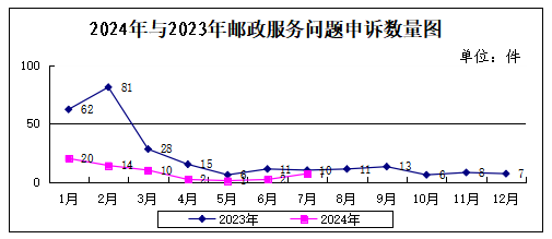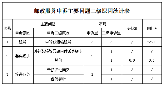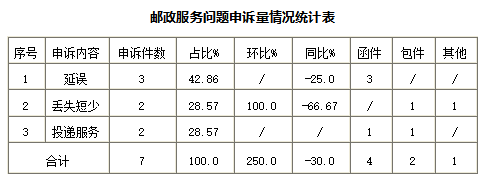 用户对邮政服务问题申诉7件,环比增长250%,同比下降30%。