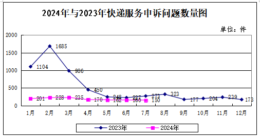 1.用户对快递服务问题申诉150件,环比下降6.25%,同比下降45.05%。