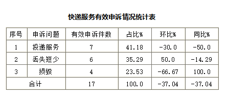 用户对快递服务问题有效申诉17件,环比下降37.04%,同比下降37.04%。快递服务有效申诉主要是投递服务问题,占快递有效申诉总量的41.18%;其次是丢失短少问题,占快递有效申诉总量的35.29%。