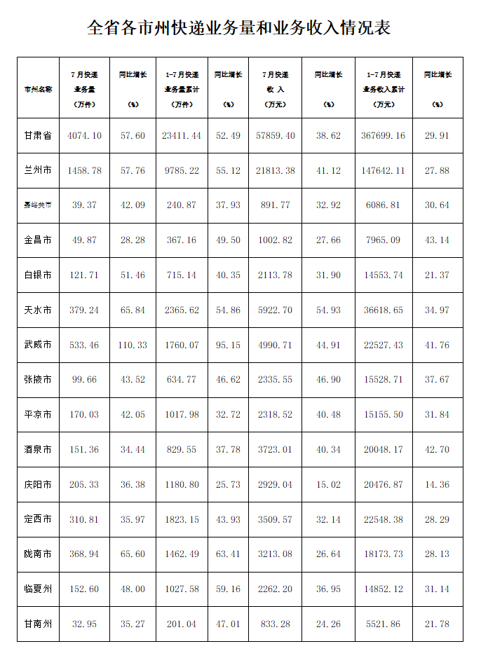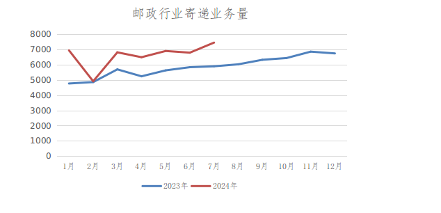7月份,邮政行业寄递业务量完成7453.78万件,同比增长26.41%。其中,快递业务量完成4074.10万件(注1),同比增长57.60%.