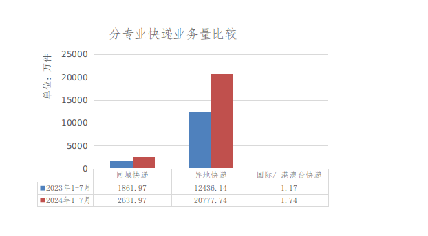 1-7月,同城业务量完成2631.97万件,同比增长41.35%;异地业务量完成20777.74万件,同比增长54.03%;国际及港澳台业务量完成1.74万件,同比增长48.32%。