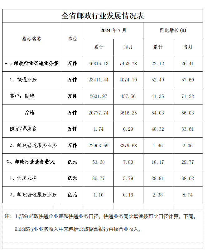 7月份,邮政行业业务收入(不包括邮政储蓄银行直接营业收入)完成7.80亿元,同比增长29.77%。其中,快递业务收入完成5.79亿元;同比增长38.62%。