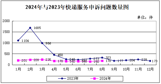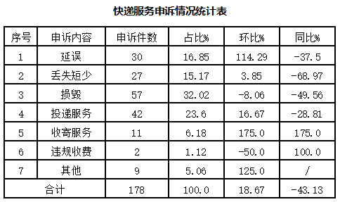 1.用户对快递服务问题申诉178件,环比增长18.67%,同比下降43.13%。