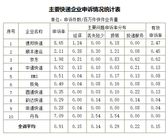 全省快递企业申诉率(百万件快件业务量)平均为0.91,有效申诉率平均为0.15。用户对快递企业申诉主要问题中,快件延误申诉率平均为0.15,快件丢失短少申诉率平均为0.14,快件损毁申诉率平均为0.29,快件投递服务申诉率平均为0.22,高于全省快递企业申诉率的有3家。