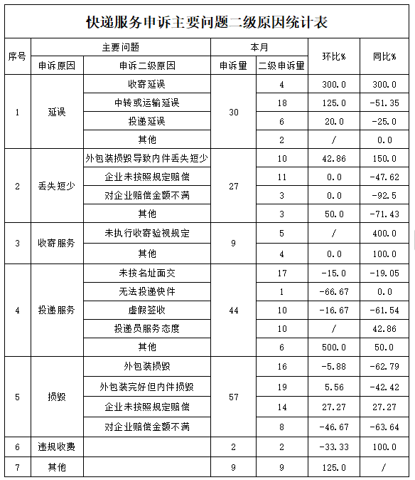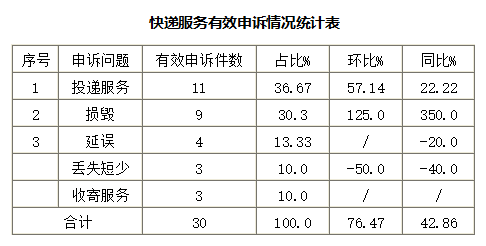 2.受理的申诉中有效申诉(确定企业责任的)为31件,环比增长72.22%,同比增长34.78%。其中,涉及邮政服务问题1件,同比下降50%;涉及快递服务问题30件,同比均增长42.86%。