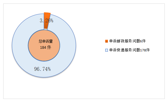 通过“12305”邮政业用户申诉电话和申诉网站共处理申诉184件,环比增长17.2%,同比下降43.21%。申诉中涉及邮政服务问题6件,占总申诉量的3.26%,环比下降14.29%,同比下降45.45%;涉及快递服务问题178件,占总申诉量的96.74%,环比增长18.67%,同比下降43.13%。