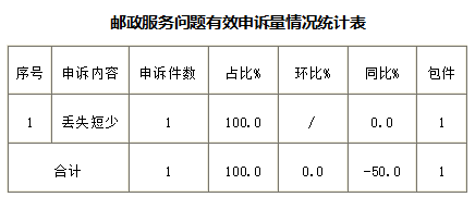 用户对邮政服务问题有效申诉1件,同比下降50%,申诉的主要问题丢失短少。