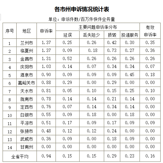 各市州申诉率(百万件快件业务量)平均为0.94,有效申诉率平均为0.16。各市州申诉主要问题中,快件延误申诉率平均为0.15,快件丢失短少申诉率平均为0.15,快件损毁申诉率平均为0.29,投递服务申诉率平均为0.23,高于全省平均申诉率的市州有4个。