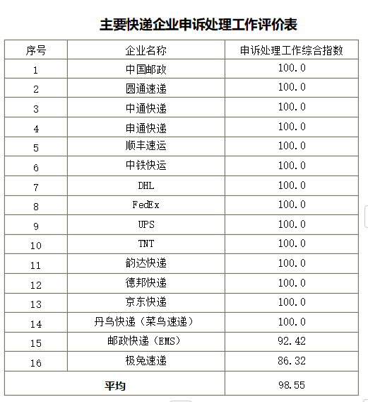 16家主要快递企业申诉处理工作综合指数平均为98.55,高于平均综合指数企业有14家。