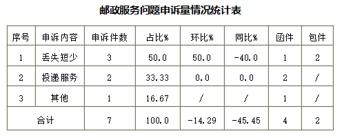 用户对邮政服务问题申诉6件,环比下降14.29%,同比下降45.45%。