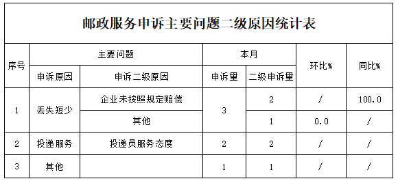 邮政服务申诉的主要问题是丢失短少,占邮政申诉总量50%,环比增长50%。